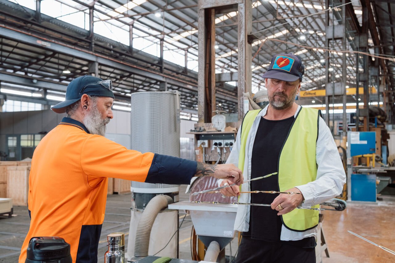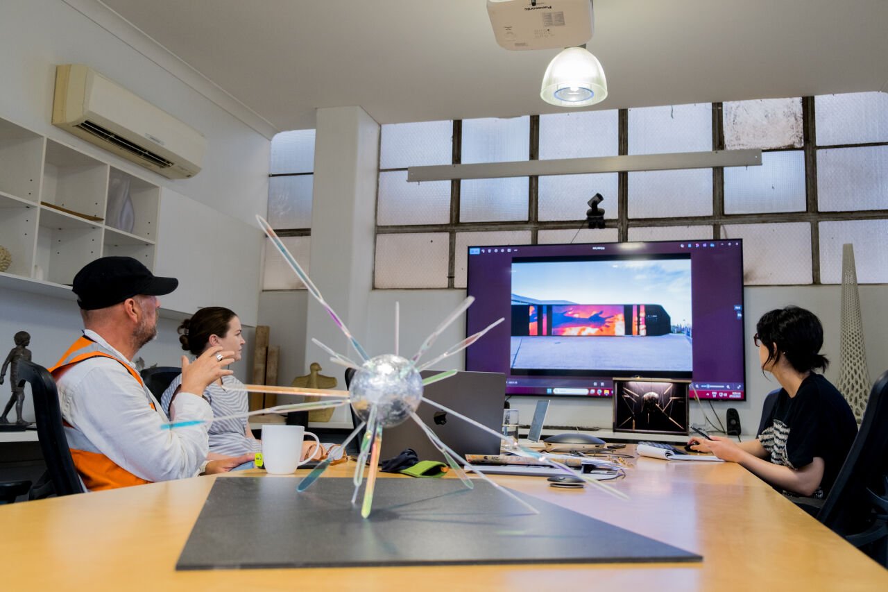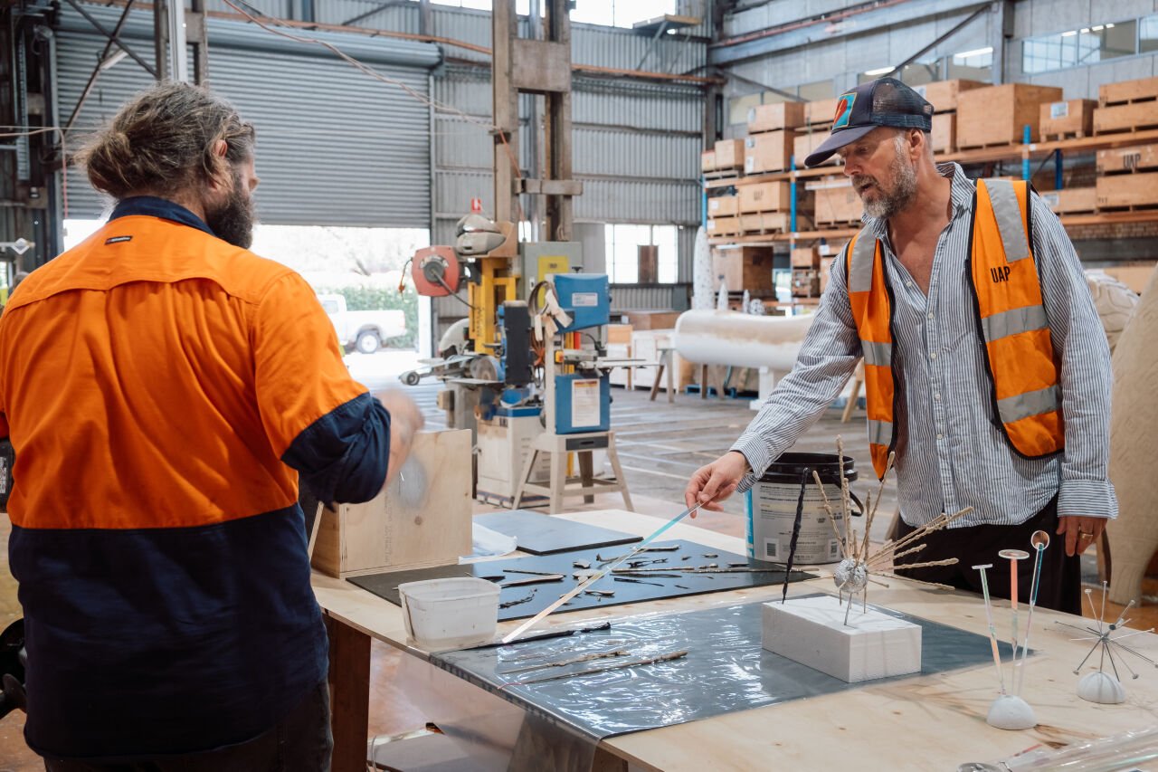 (TG): My recent residency at UAP was instrumental in expanding how I think about my visual language, particularly in relation to shape, form, and materiality. Over two weeks, I worked closely with the design team and spent time on the factory floor experimenting with a wide range of materials and fabrication processes. This collaborative, hands-on environment opened up new ways of thinking and making, especially in relation to my current project ASTROGAZE, which explores the Cosmos of Lutruwita / Tasmania. The residency sparked a new level of excitement about the possibilities ahead—seeing ideas move from concept into sculptural form revealed powerful new pathways for my practice and has reshaped how I imagine this project evolving in the public realm.