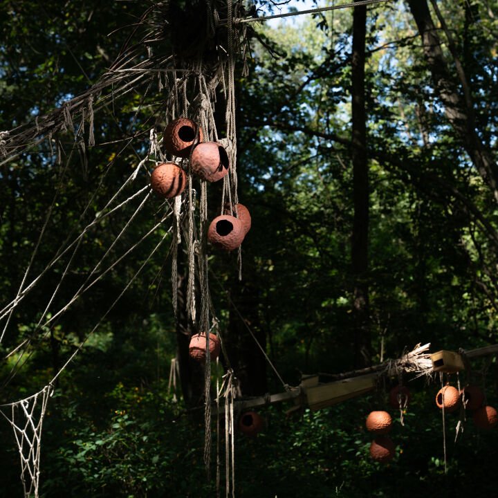 Working in close collaboration with wildlife experts from Instituto Vida Livre in Rio de Janeiro and the Mass Audubon Boston Nature Center, Lima designed a series of sculptural elements that function as both habitat and gesture. These forms, produced with local artisans in wood and ceramics, operate within a living ecosystem where authorship is shared and unpredictable.