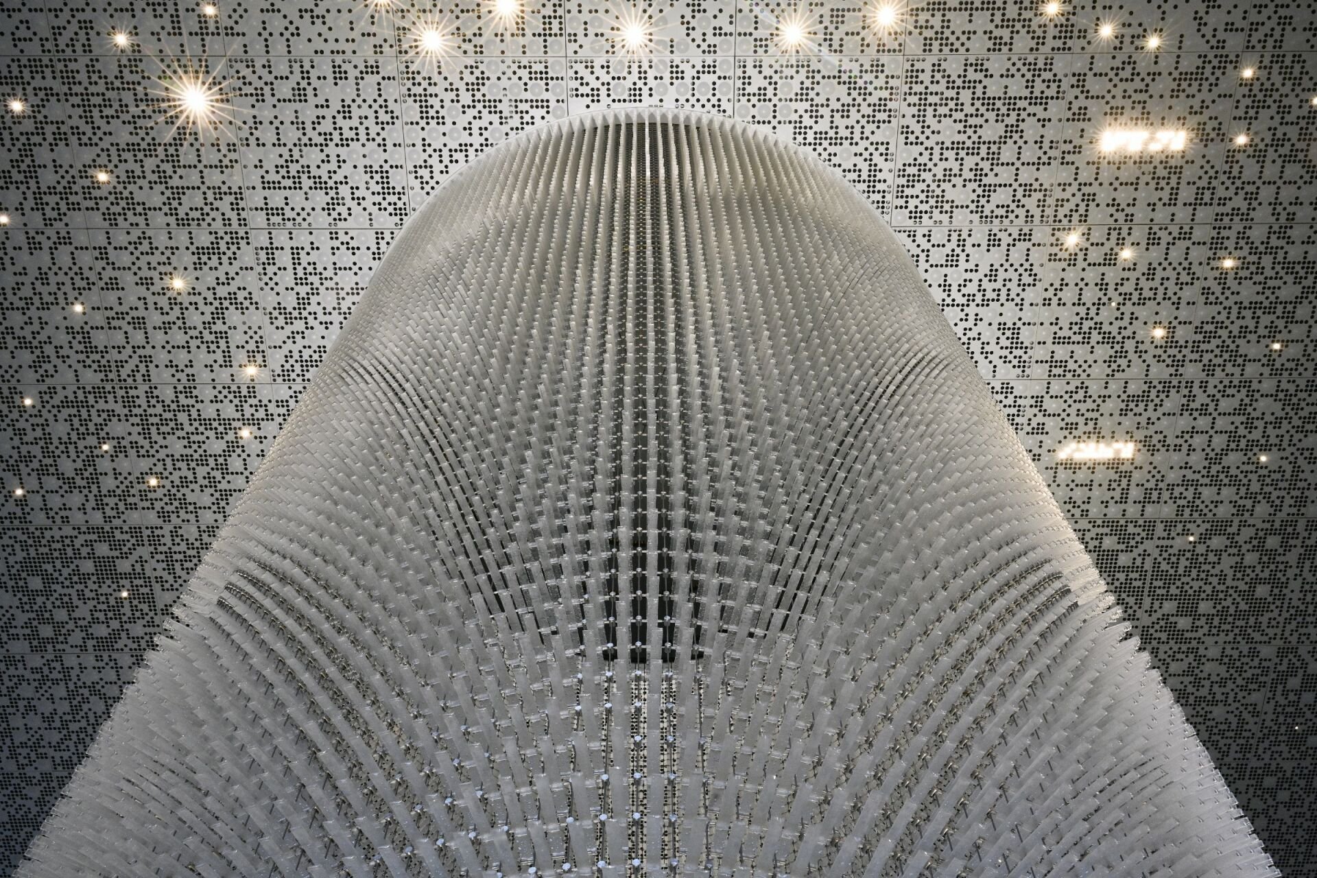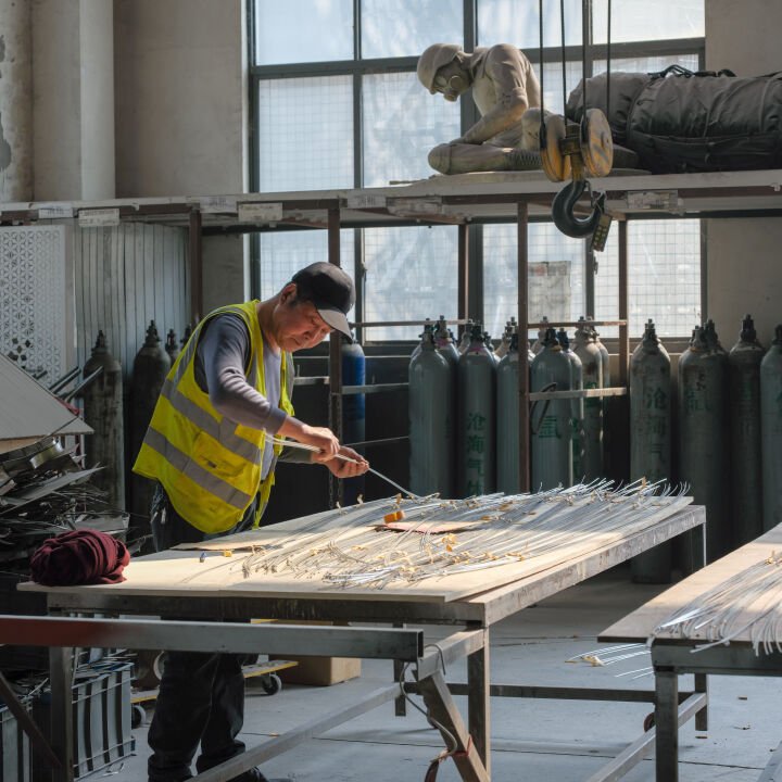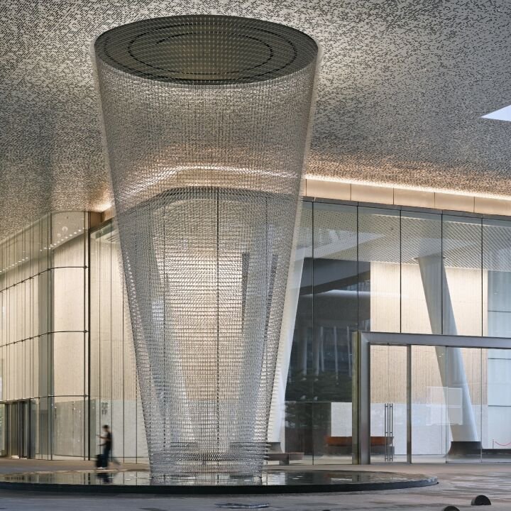 Our Shanghai team worked from concept to completion, leading fabrication and collaborating closely with the artist and architects to integrate the piece into the towers. Alongside the sculpture, we designed and cast over 500 custom aluminum panels at our foundry, now installed across the lobby walls and elevators. Each panel carries its own handmade texture, grounding the space with a material language that mirrors the motion above. Together, the sculpture and architectural elements transform this new landmark into a space where art, atmosphere, and innovation converge.