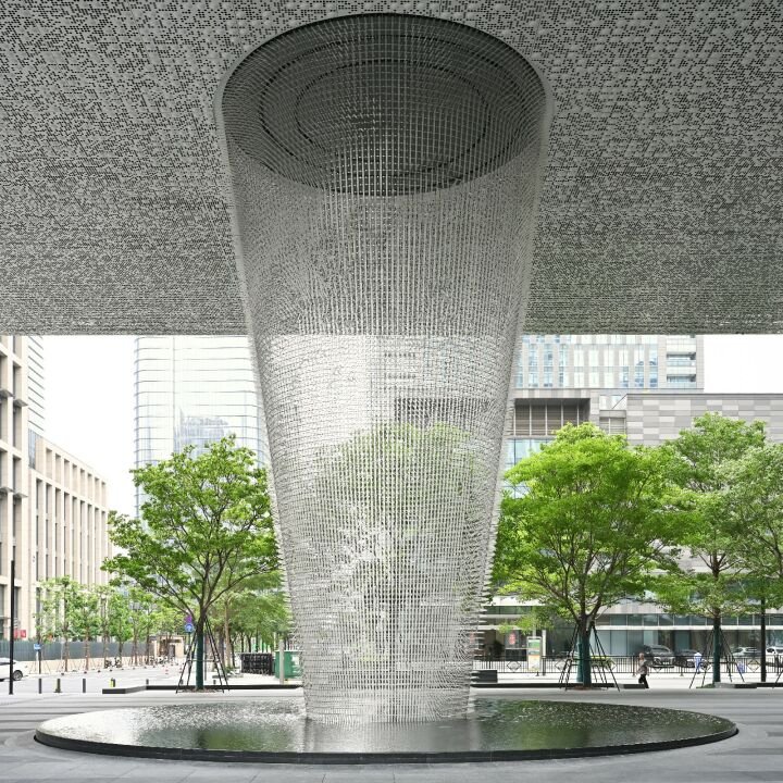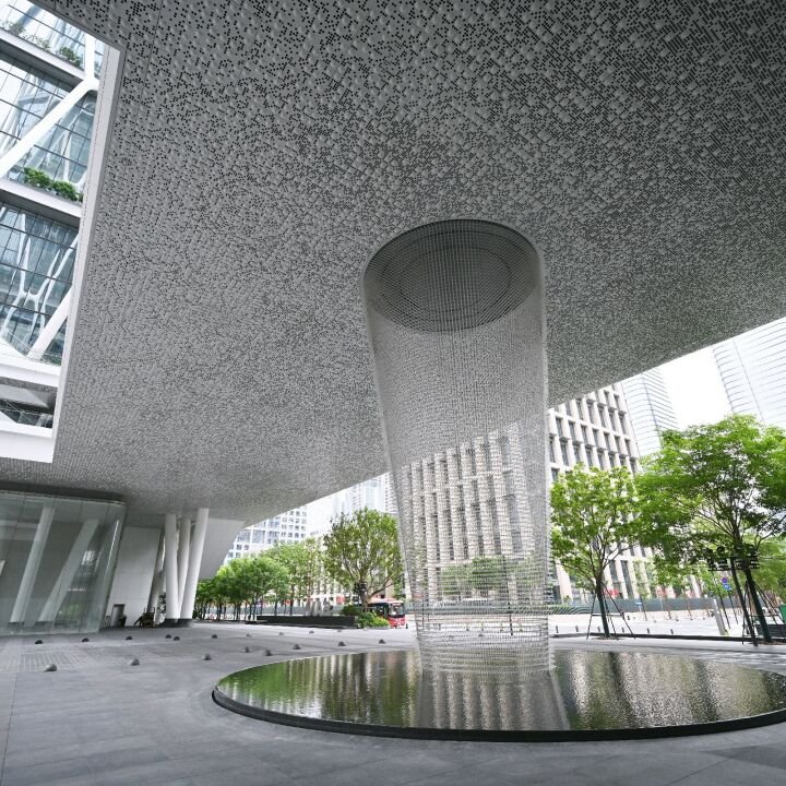 Funnel Cloud by Ned Kahn harnesses the forces of nature and brings it to the heart of Pazhou, Guangzhou. Suspended between the Sany Group and Irootech headquarters, the wind-powered sculpture rises from a reflecting pool. It stretches to the ceiling, and its conical net is filled with thousands of translucent elements that sway in the wind and shimmer with falling water.