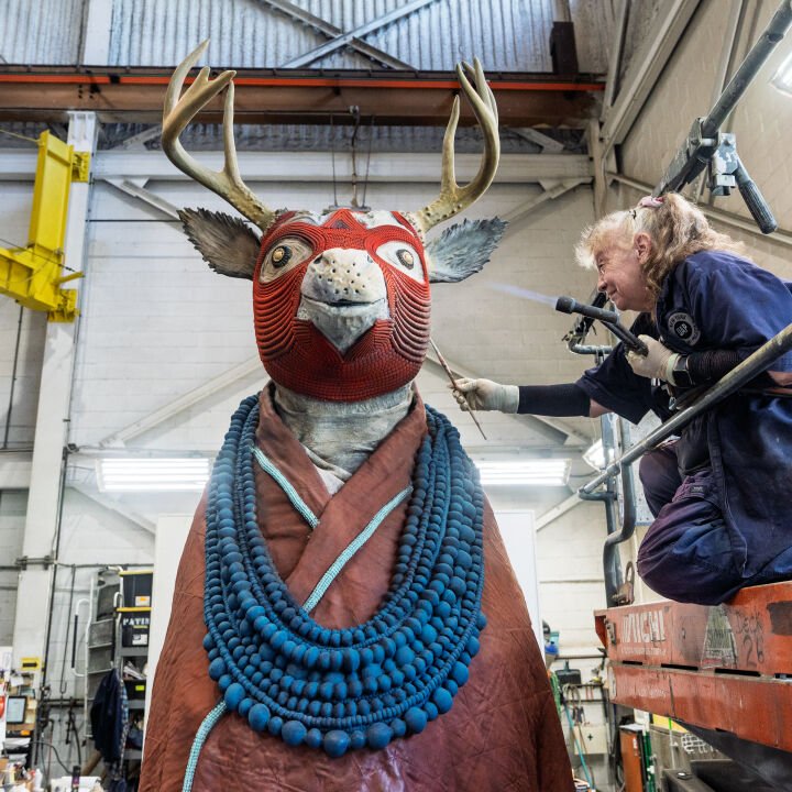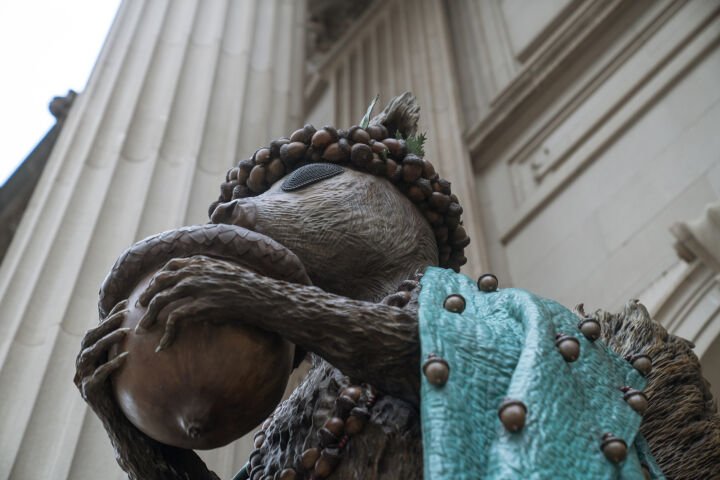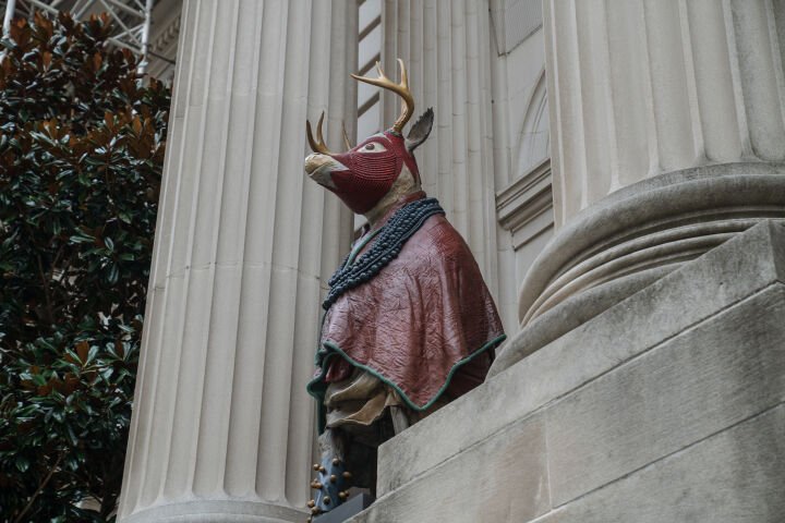 The four sculptures- a deer, hawk, squirrel, and coyote- draw on Gibson's well-developed iconography and sculptural practice, which combines Native North American aesthetic traditions and histories with abstracted patterning evoking materials like beading and textiles. Drawing upon his knowledge of Indigenous kinship philosophies and the lectures of Jacques Derrida, Gibson's sculptures emphasise the deep relationship between humans and animals, as well as their connection to the earth.
