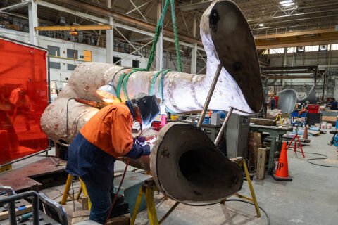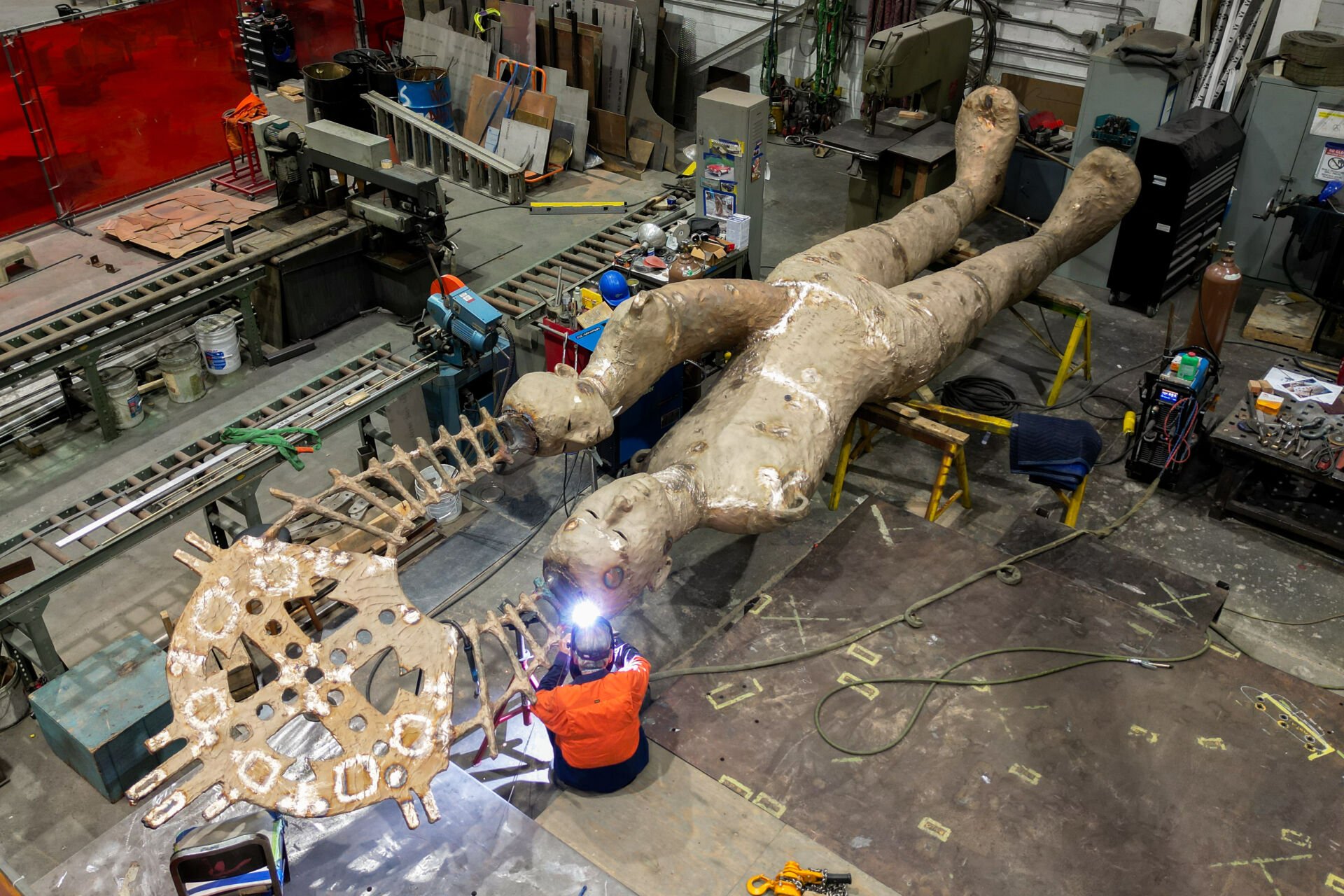 The 25-foot-tall, 3,380-pound sculpture was stood up to check the patina and finishing progress. The patina process not only protects the sculpture from environmental damage but also adds depth and complexity to its appearance.
