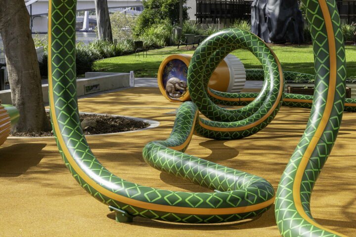 In a first for the Queensland Cultural Centre, an artist-designed play sculpture in the form of an oversized 119 metre-long garden hose has been unveiled outside Brisbane’s Gallery of Modern Art.