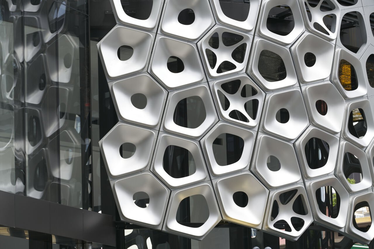 The artwork captures the shimmering qualities of light reflected on moving water, reimagining this natural phenomenon through rhythmic panels of form. The result is an ever-changing facade that engages passersby through shifts in light, animating the building and its context.