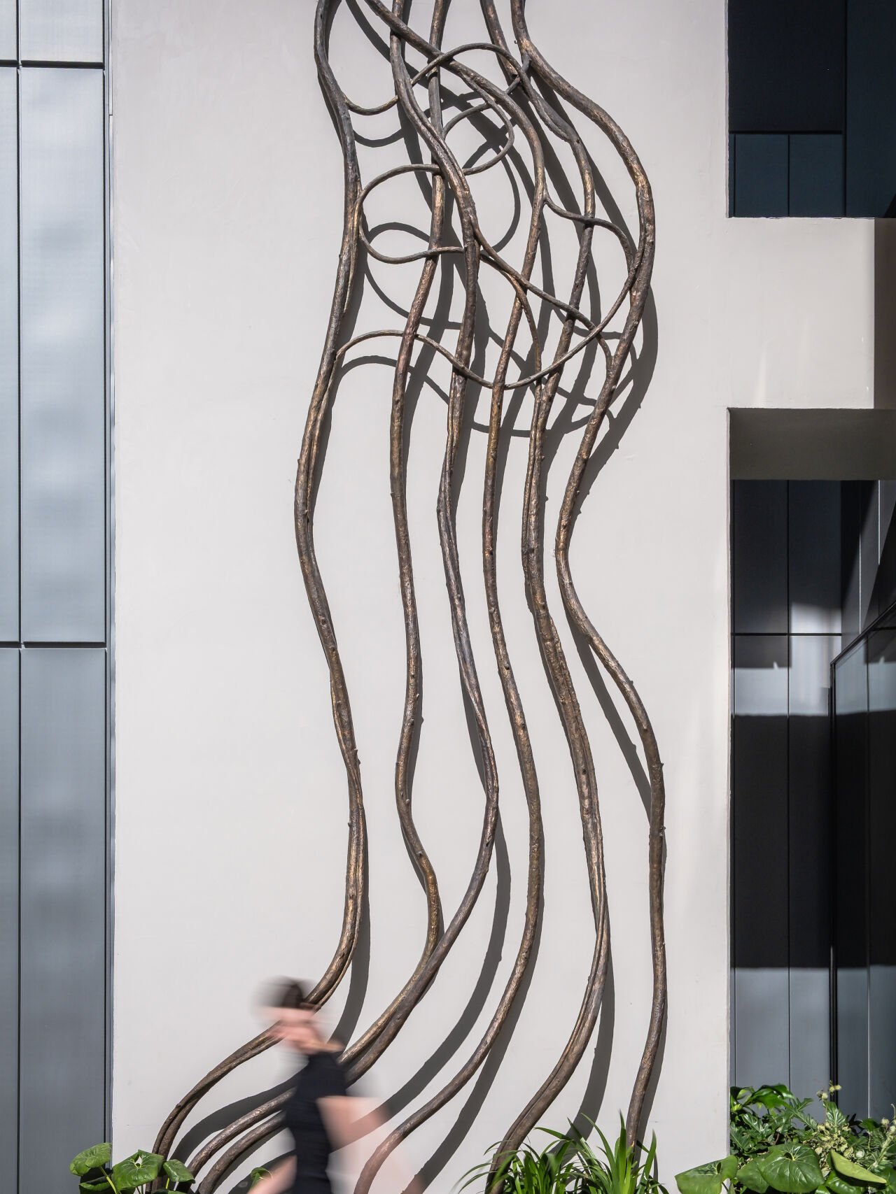 At 400 George Street, Carmichael honours human and non-human kin by tracing thousands of years of First Nations knowledge and connection to Country. The work references the Talwalpin (native cotton tree), a plant rich with associations valued for its fibre and sapwood used in weaving and medicine, and embedded within cultural stories shared by First Nations communities. Drawing inspiration from the interconnectedness of the tree’s spreading branches, the sculpture’s forms climb and weave skyward from roots grounded in the earth. The artwork unfolds across multiple elements including the primary tree-like sculpture, a scattering of fallen Talwalpin leaves cut from sheet brass and inlaid into the ground plane, and a singular dilly bag positioned within a mezzanine-level communal space. Together these gestures extend the experience of the work, inviting both distant admiration and close, tactile engagement.