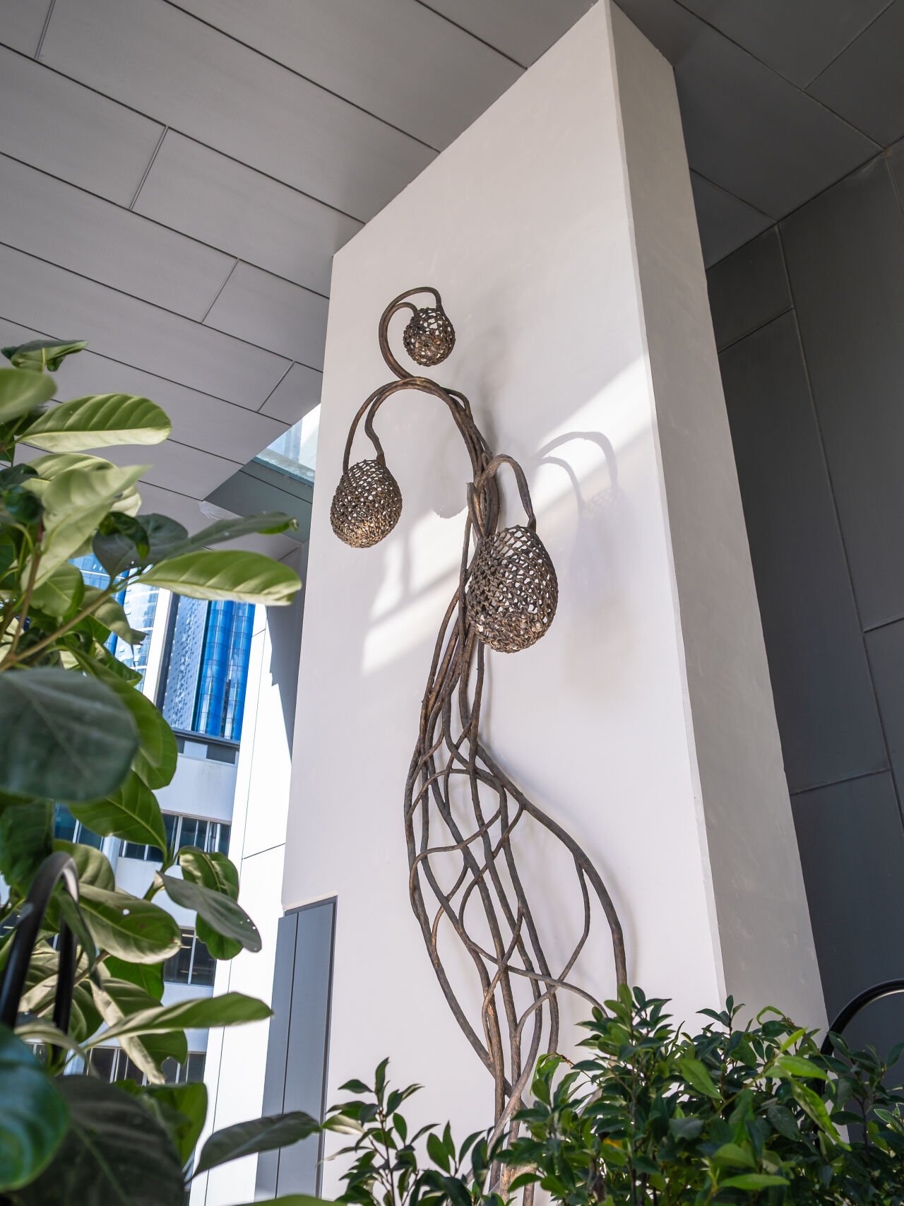 The curatorial vision, Reimagining Landscapes, was crafted to serve as a source of inspiration for the artists responding to the brief and to situate their proposals within broader conversations about the site’s evolving identity. Artists were encouraged to reflect on the layered subtropical planting that would soon frame the forecourt and to draw inspiration from nature’s determination to revive in the wake of urbanisation. Three potential locations were identified for creative exploration: two towering supporting columns and a street-facing planter bed capable of hosting an array of discoverable sculptural elements.