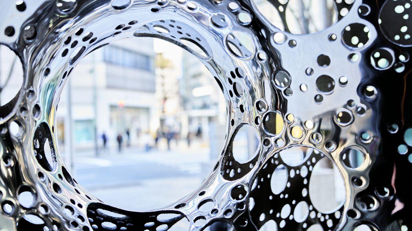 Our Brisbane team helped Lee create this work which consists of two forms; a tall ovoid rising to 3.4 meters and a circular torus measuring 2 meters in diameter. Made from mirror-polished, cast stainless steel, the fabrication of this work demanded rigorous welding, hand plasma cut apertures and an exceptional level of finishing to achieve its mirror-polished surface.