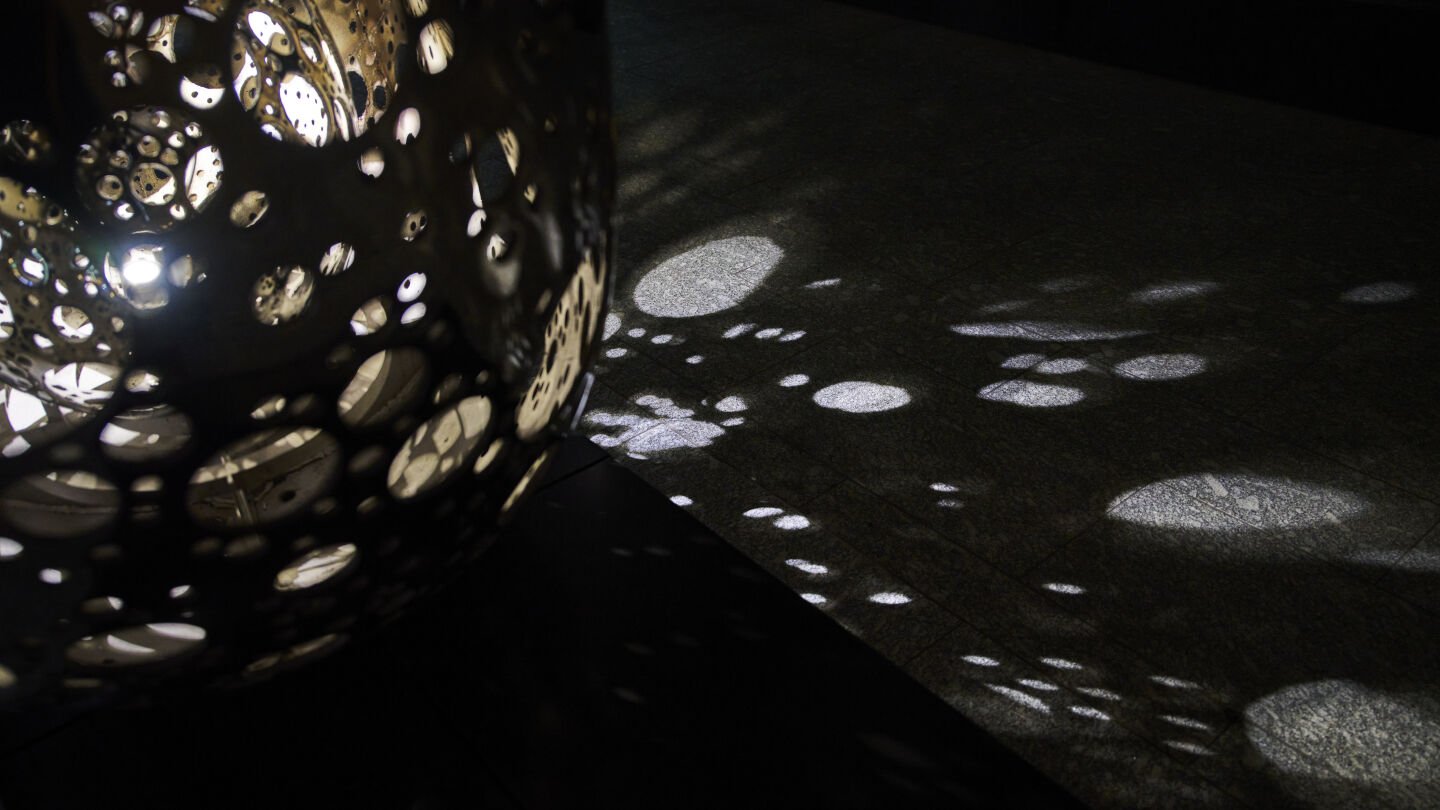 As evening falls, the works are illuminated from within and light spills through enlarged apertures, breathing life into its environment as the internal light projects shadows on its surroundings. The light, transforming the sculptures which shift between solidity and radiance, revealing a smaller cast ovoid form nestled within the larger torus and allowing viewers to see the intricate patterns on both sides of the sculpture simultaneously.