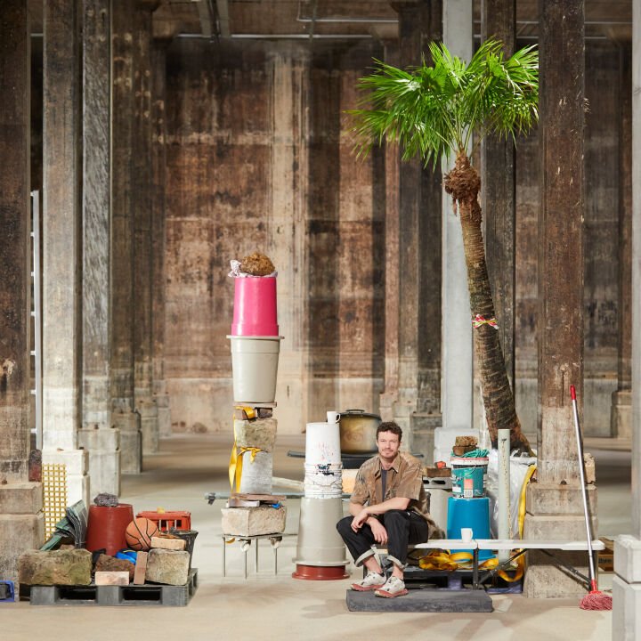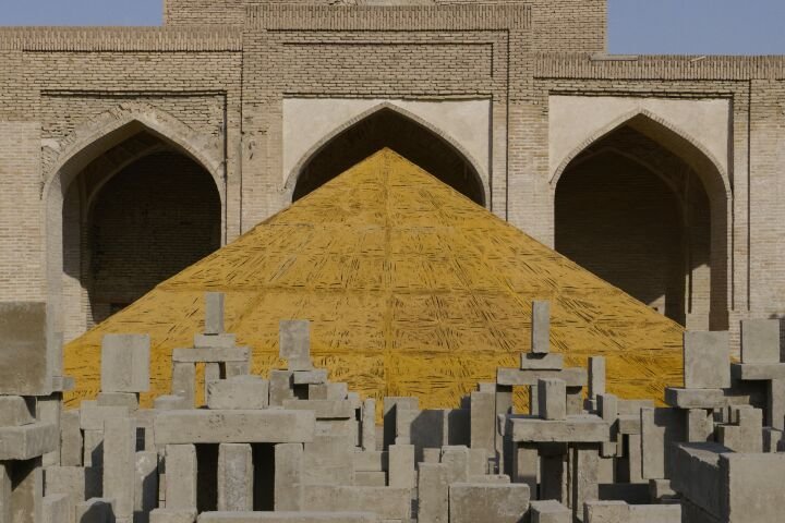 Antony Gormley’s Close (2025), a collaboration with Temur Jumaev and local brickmakers, is one of the biennial's most ambitious site-specific commissions. Situated within the ruins of the Khoja Kalon mosque built in 1598, the work comprises 95 tons of unfired, sundried earth and straw. The bricks were hand-made to form ‘pixelated’ bodies, employing the same vernacular techniques of how buildings in the city were made. Visitors navigate the maze-like installation, encountering 100 sculptures in crouching, reclining, or meditating postures, compelling a close proximity and bodily engagement. Absorbing its heritage context, the artwork appears to transform throughout the day with the play of light and shadow. It extends Gormley's longstanding exploration of material physicality, the way parts come together as a whole, and his interests in human history, while addressing the idea of the body as a dwelling.