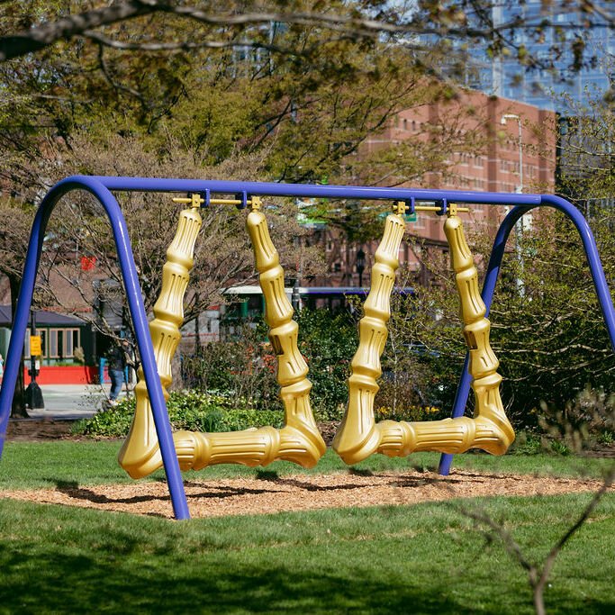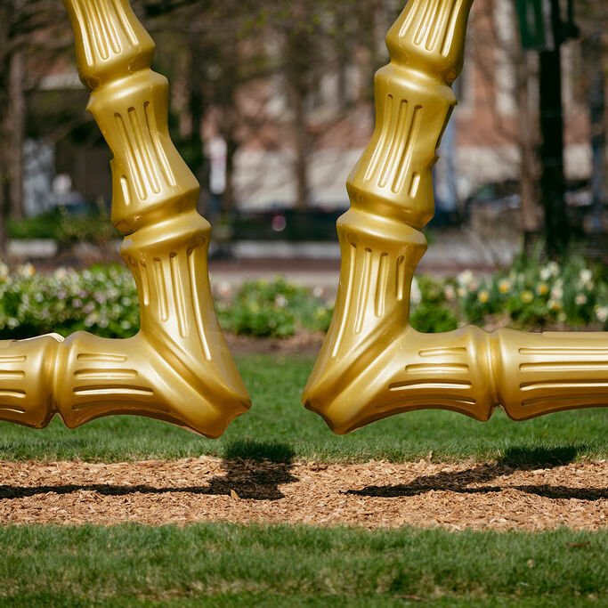 Made of steel, resin, and fiberglass composite, epoxy paint, and polyurethane, Ortega’s 10-foot-tall monument recognizes the cultural significance of these earrings and rightly credits the mainly urban, working-class girls and women of color who wear them as critical artistic innovators and fashion influencers. Its iconicity is matched only by its practicality: it is an actual swing set with two built-in sets of handles, for children’s or everyday use. By infusing the public space with childhood memories, hip-hop culture, and opportunities to rest and play in a city known for its monuments, “Big Hoops” ambitiously puts Black and Brown girls at the center of Boston’s recent past and our current civic imagination.