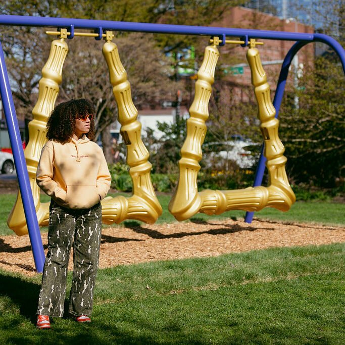 Travel to downtown Boston until next October, and you’ll come across a large-scale sculpture I would never have imagined as a Black girl growing up in Dorchester in the early 1980s. Currently on display at the Rose Kennedy Greenway, you can catch Ja’Hari Ortega's Big Hoops to Fill, a functioning swing set in the form of gigantic gold bamboo earrings, or, as they are colloquially known, “door knockers.” Roxbury-born artist Ortega grew up mesmerized by the jewelry her mother adorned and shared with her. She also remembers how Black and Latinx girls and women popularized gold bamboo earrings within hip-hop’s early days.