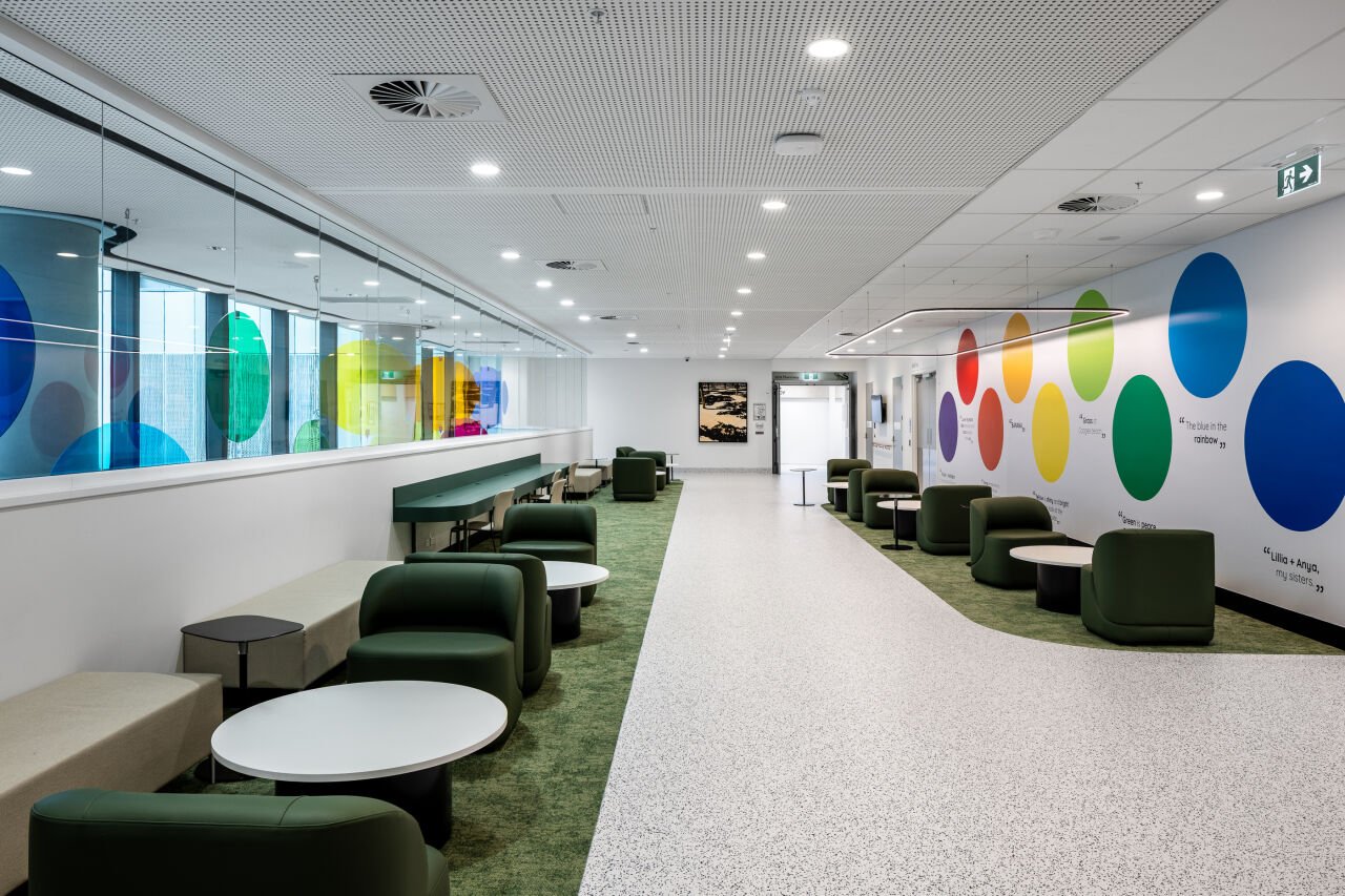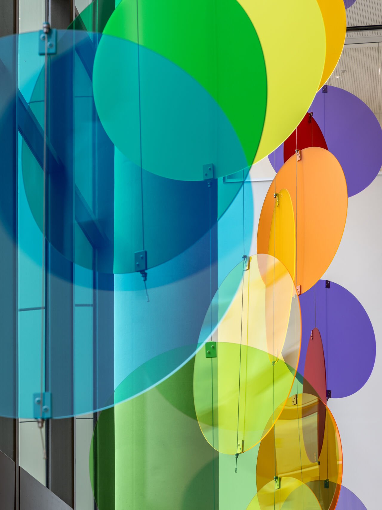 Circles of colour in vinyl, echoing the palette of the atrium installation, stretch horizontally across this wide wall. They serve in part as a colour key to the atrium work. The quotes within this artwork were gathered through workshops with children, who shared what different colours represent to them. Viewers are invited to read and reflect on these responses - considering their own emotional and personal connections to colour. From here, they can move toward the suspended installation, fostering a deeper relationship between the two works.