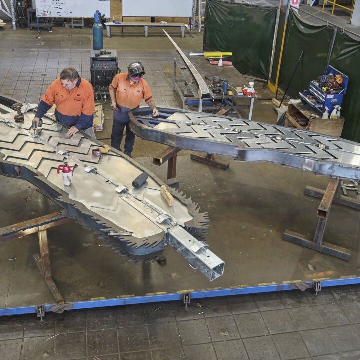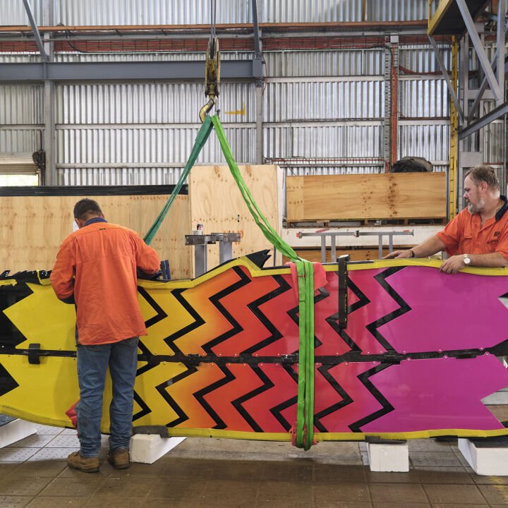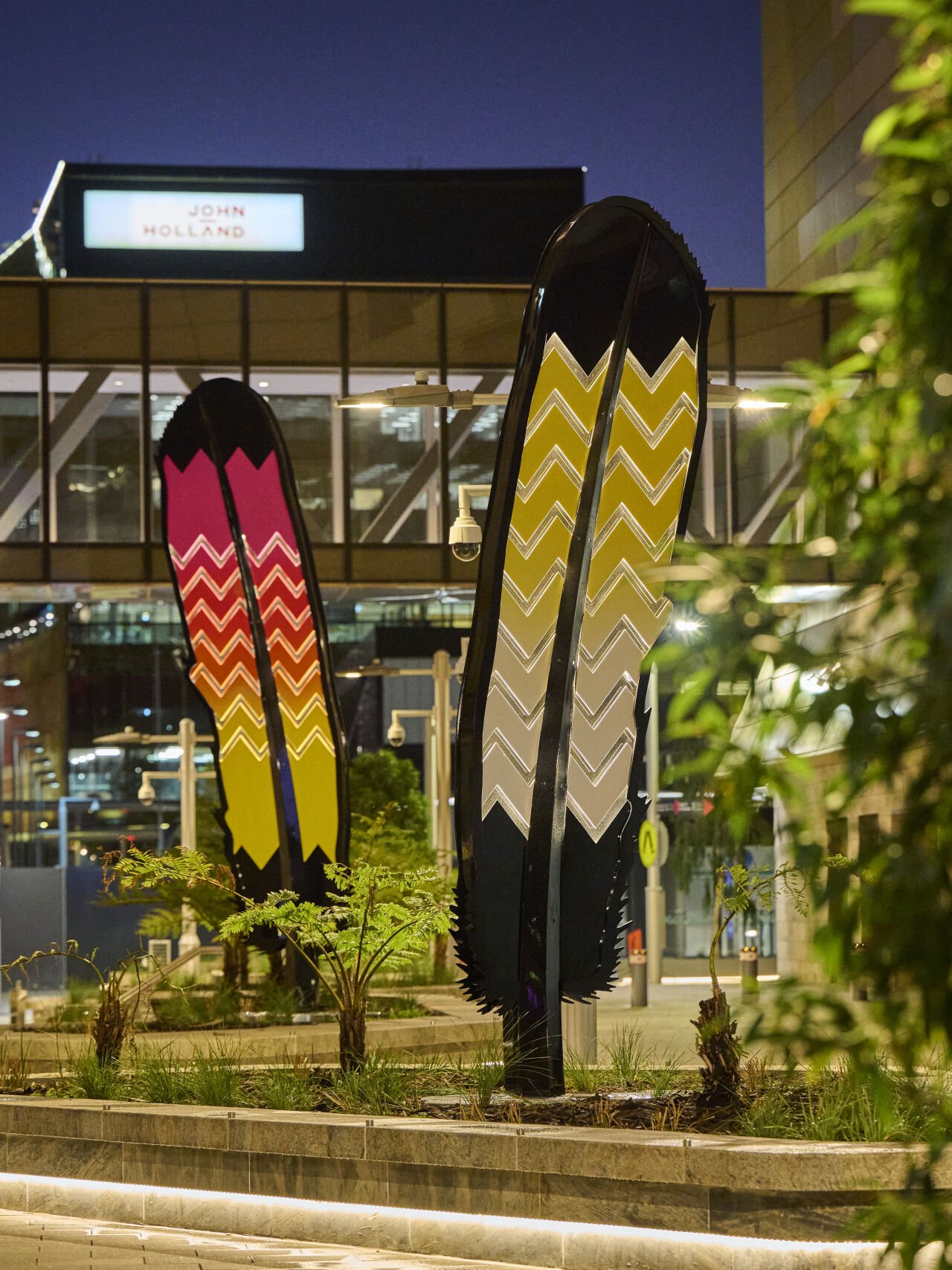 The design features two laser-cut feather profiles, with the Karak feather adorned in a vibrant gradient of yellow, orange, red, pink, and black, while the Ngoolark feather showcases a fade of white, yellow, and black. Each feather, with a central spine made from folded metal displaying a glossy black mirror finish, incorporates recessed chevron lighting. The Red-tailed Cockatoo feather is 5 metres tall and has seven chevron lines on each side, whereas the White-tailed Cockatoo feather is 4 metres tall and has twelve chevron lines, all enhanced by programmable multicoloured LED strip lighting that automatically activates at sunset and deactivates at sunrise.