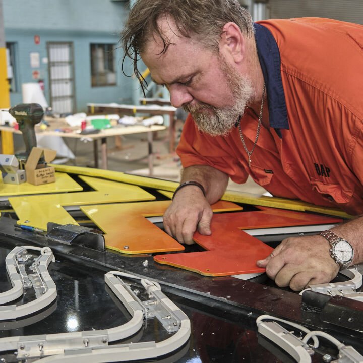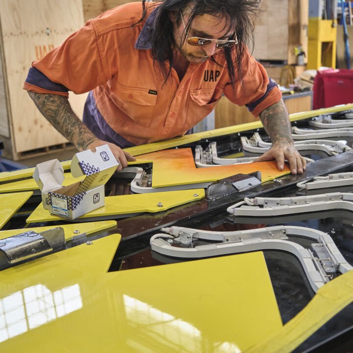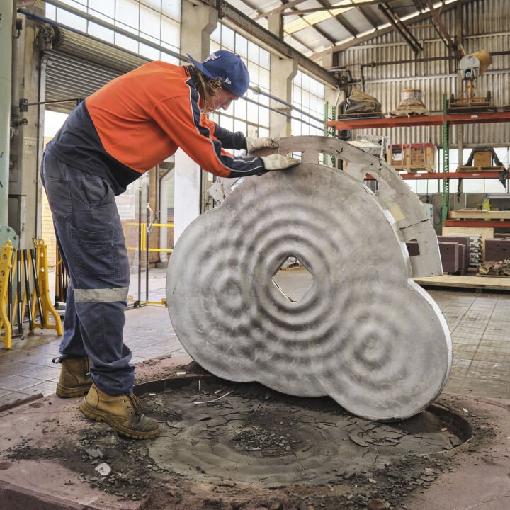After detailed discussions Rennie had with Whadjuk Noongar Elders, Traditional Custodians of the land encompassed within the university buildings footprint and with Apparatus as the Art Consultant , he developed a new artwork for the ECU City Campus, titled ‘Journey’. ‘Journey’ incorporates references to the Karak (Red-tailed Black Cockatoo), Ngoolark (White-tailed Black Cockatoo), and Lake Goologoolup, highlighting the wetlands. These birds act as boorongar or totems for Noongar people, denoting kinship ties, cultural identity and connection to place, and serving as messengers that bridge the physical and spiritual realms. The vibrant hues of the feathers, crafted by the artist, along with the unique markings found on each section, together reflect the cockatoos and the journeys undertaken by Noongar people throughout their Country