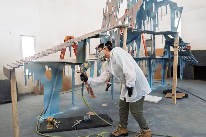 Our Rock Tavern team played a vital role in bringing this ambitious project to life by digitising Al-Hadid's original drawings and coordinating with structural engineers to ensure compliance with codes. Throughout fabrication, Al-Hadid spent several days a week at our Rock Tavern foundry over many months, working directly alongside our team. The process involved developing detailed 3D models for the aluminium plate sculptures, while also providing essential advice on materials, production methods, and structural connections.